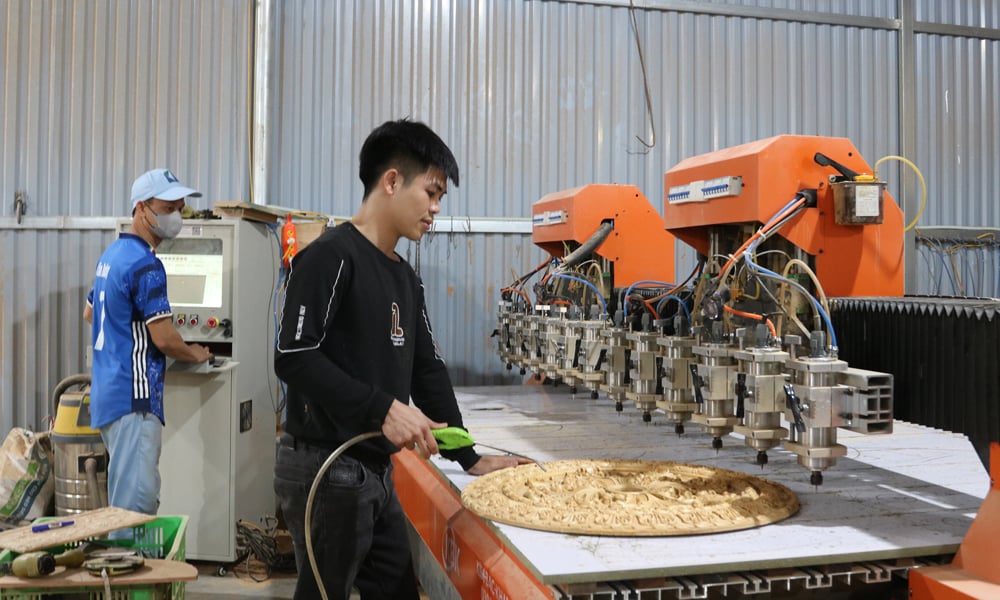 “Hiện tôi đã ký 10 hợp đồng đóng trần gỗ cho khách hàng trong và ngoài tỉnh. Vừa ăn Tết xong là bắt tay vào sản xuất ngay để kịp tiến độ”, anh Phong cho biết. Để đáp ứng yêu cầu ngày càng cao của thị trường, anh mạnh dạn đầu tư máy móc hiện đại. Chỉ riêng trong năm 2025, cơ sở đã lắp đặt thêm máy CNC đục, cắt vi tính trị giá hơn 200 triệu đồng, cùng máy chà nhám công nghệ cao, giúp sản phẩm có độ bền, tính thẩm mỹ cao, đồng thời giảm nhân công, tăng hiệu quả sản xuất.